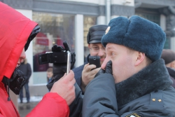 Другая горожанка пожаловалась, что полицейский ударил ее по голове видеокамерой. Тот все отрицал. Депутат гордумы Геннадий Турунтаев пытался пристыдить стража порядка.