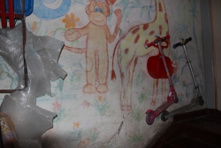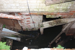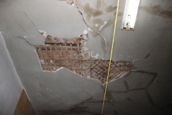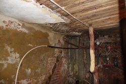 К примеру, в одной из комнат деревянные доски пола вздыбливаются, если на них наступить ногой. С потолка осыпалась массивная часть штукатурки.