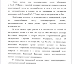 В обращении говорится, что в адрес председателя ГД поступает большое число обращений жителей Саратова, в которых они жалуются и приводят факты нарушения их прав в связи с ежемесячным повышением тарифов на оплату услуги по теплоснабжению квартир со стороны ПАО «Т Плюс». Так, за март людям поступили платежки за февраль, где стоимость услуги выросла с 1 500 до 3000 рублей.